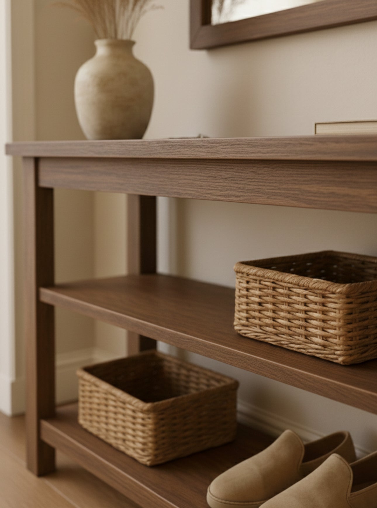 De raka linjerna och de öppna hyllplanen ger en stilren men funktionell design som passar perfekt i hemmets entré. Den kombinerar förvaring och estetik på ett naturligt sätt och bidrar till en välkomnande känsla i hallen.