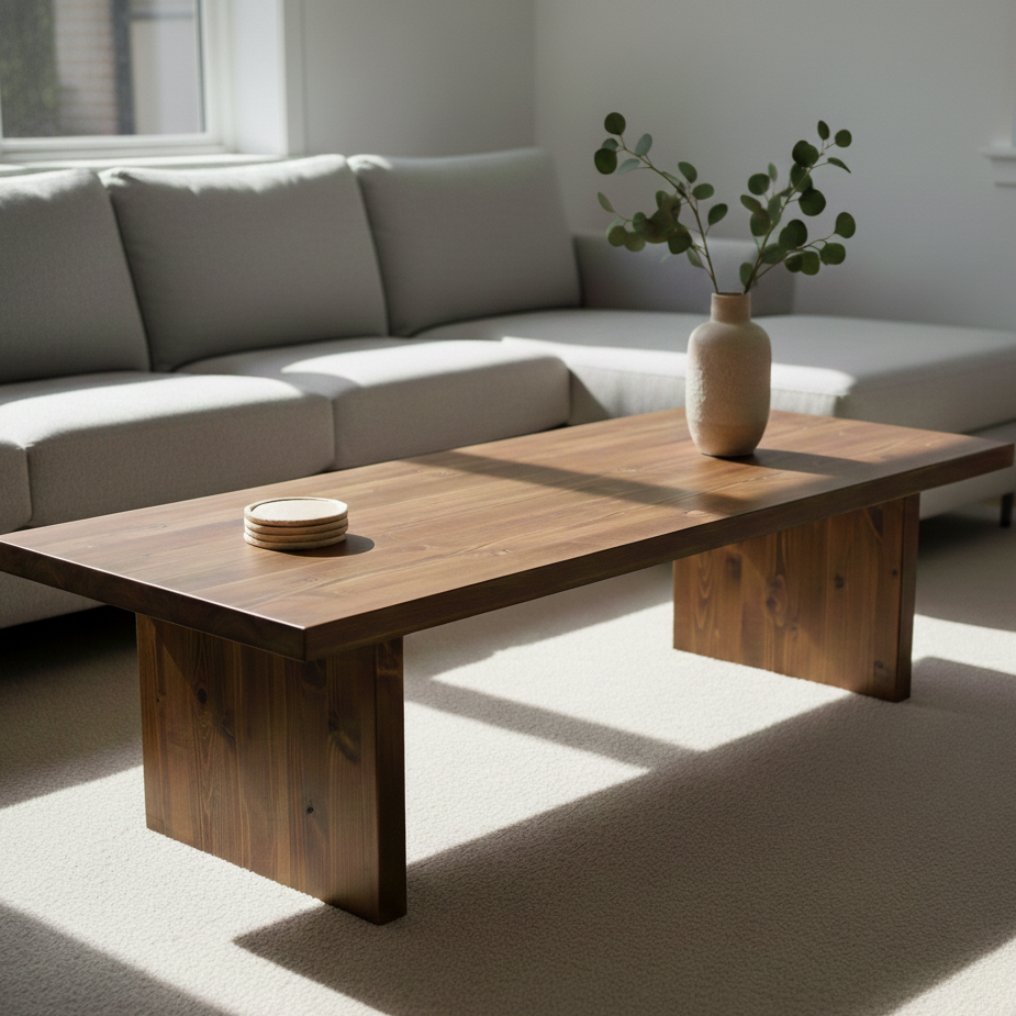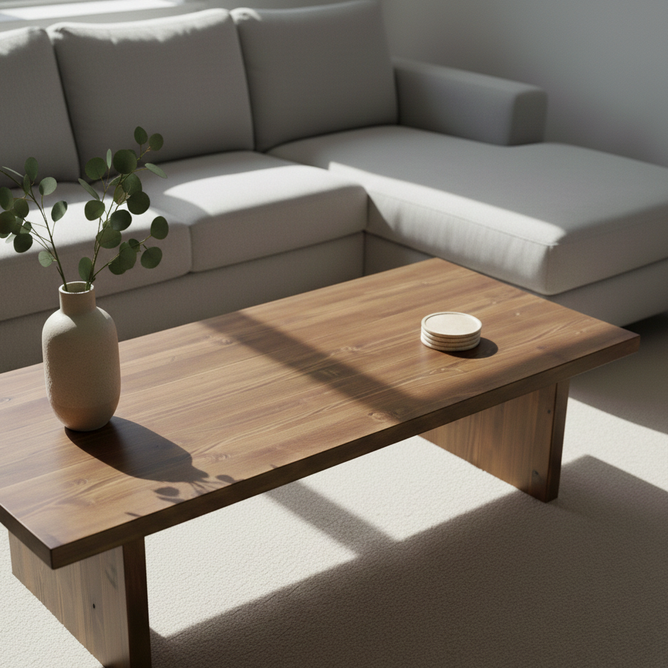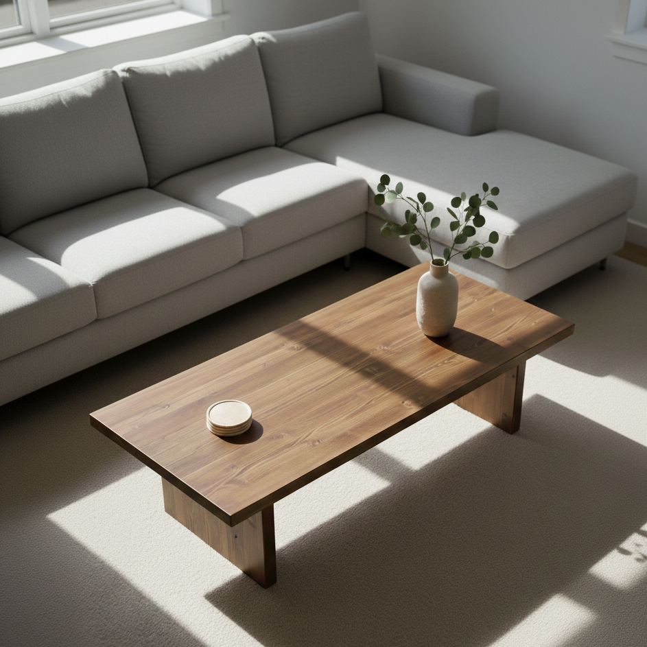 Detta massiva soffbord är handgjort i stavlimmad gran och har en lackad yta som lyfter fram träets naturliga liv. Bordet passar fint vid soffan och ger vardagsrummet en varm och harmonisk känsla.