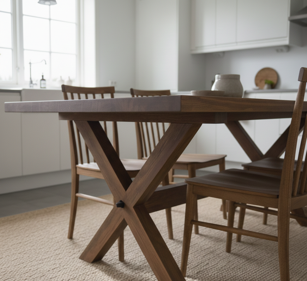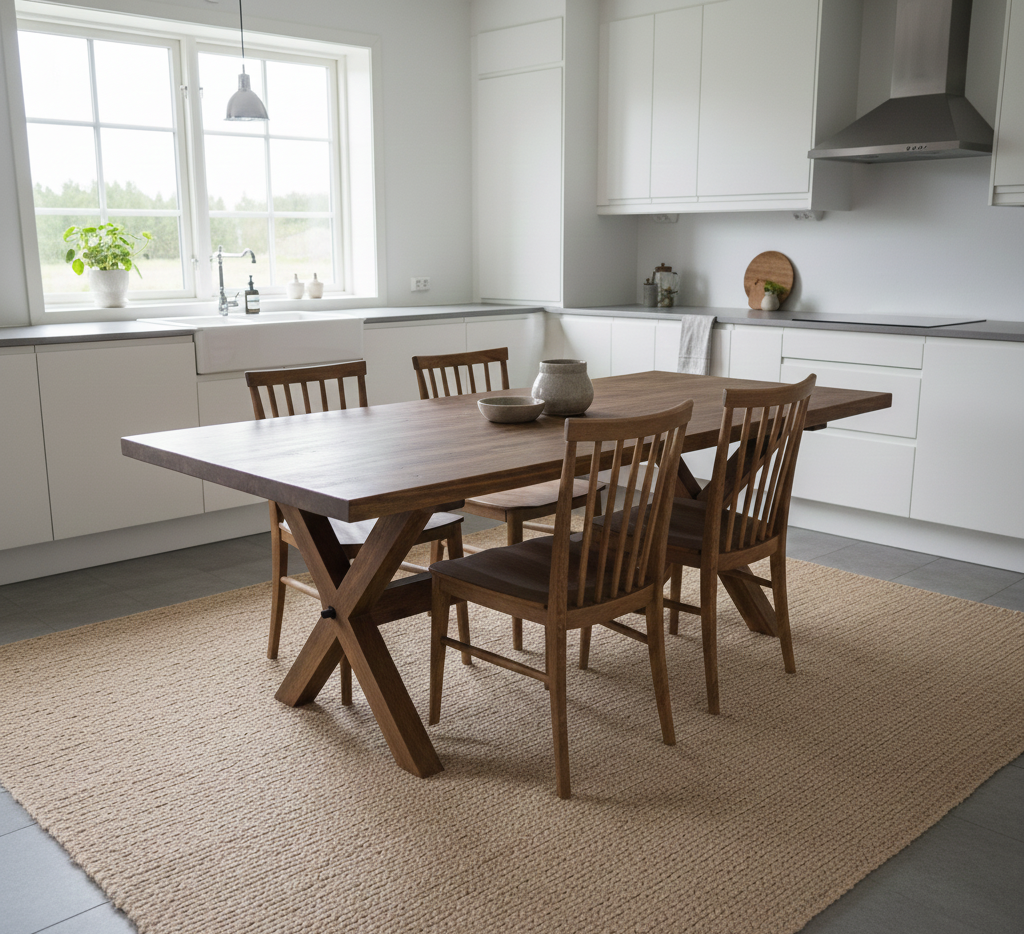 Detta matbord är tillverkat i massiv gran och har en varm och naturnära känsla som passar i de flesta hem. Bordsskivan är kraftig och stabil och lyfter fram träets naturliga variationer. Kryssbenen ger bordet ett stadigt uttryck och en tidlös form som gör att det står fint både i kök och i matsal.