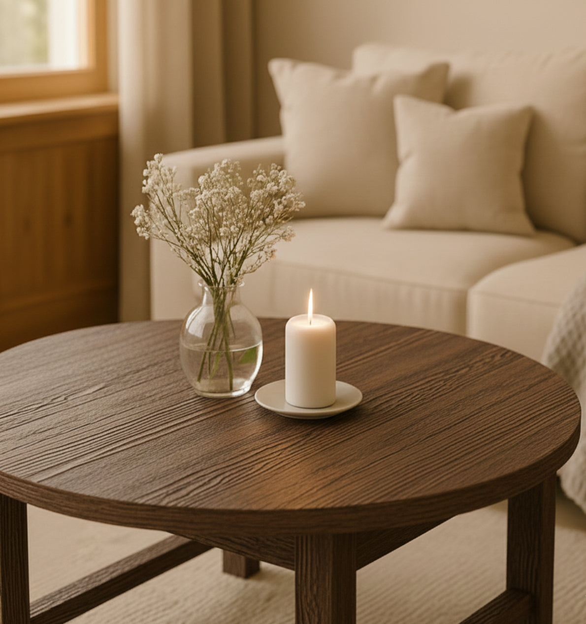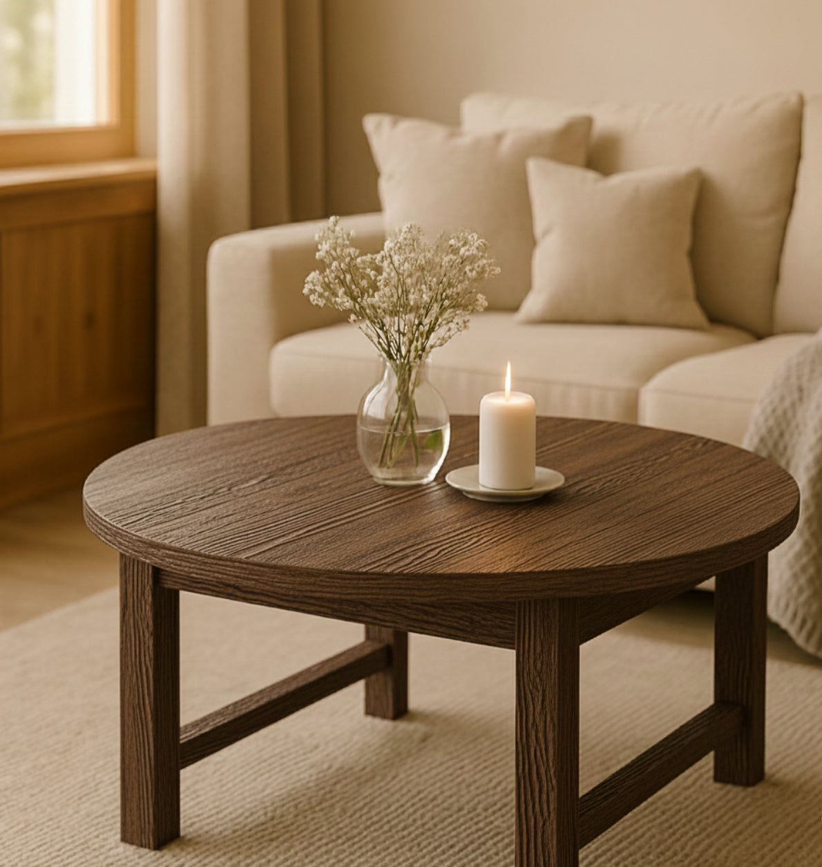 Det runda soffbordet från kollektionen Norrvik är tillverkat i massiv gran, där rustik karaktär möter modern enkelhet.
